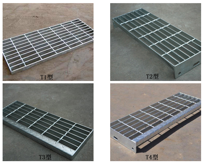 (4)T4踏步:由承載扁鋼和橫桿按照特定的比例焊接而成的,帶有前滑板和側板螺栓固定的踏步。